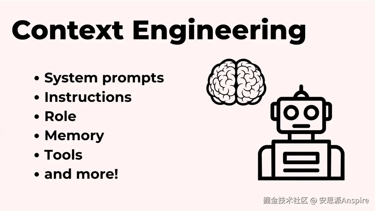 这就是所谓的"上下文工程",即你决定代理拥有哪些信息。这包括任务背景、代理的角色、过去行动的记忆以及可用工具等内容。
