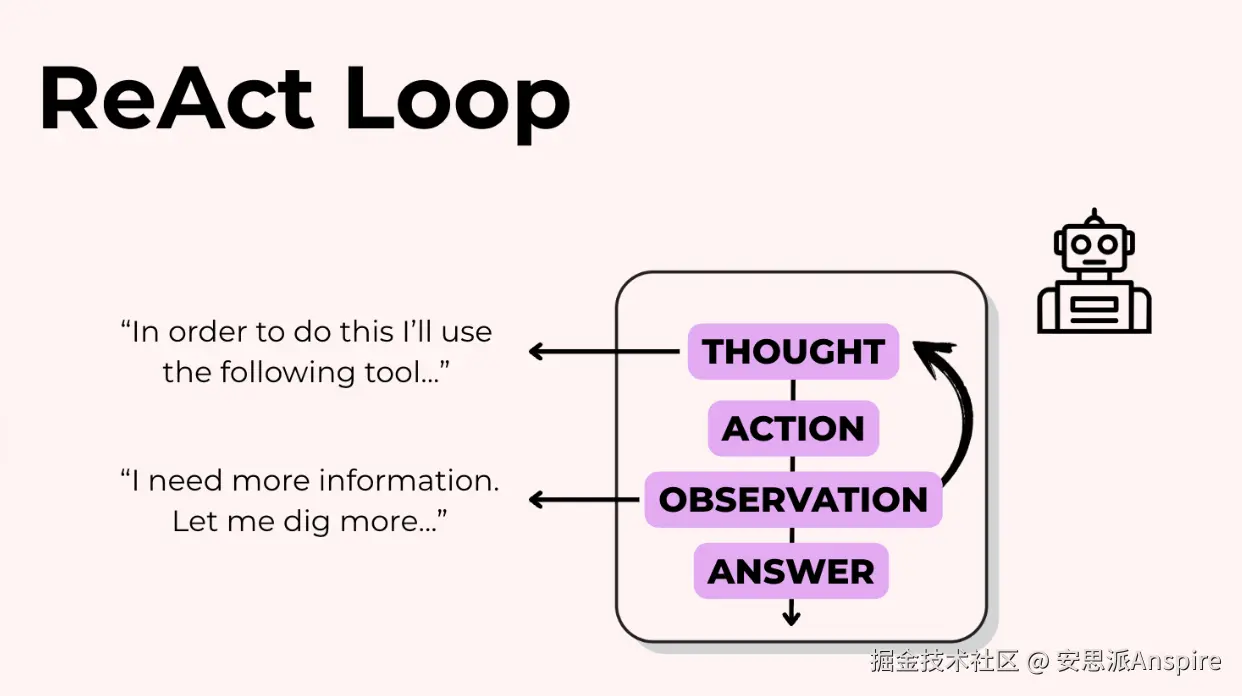 这就是人们所说的ReAct循环。模型会思考下一步该做什么,然后采取行动(通常是调用一个工具,我们稍后会详细讨论),观察结果,然后要么给你一个答案,要么循环回去再次思考。