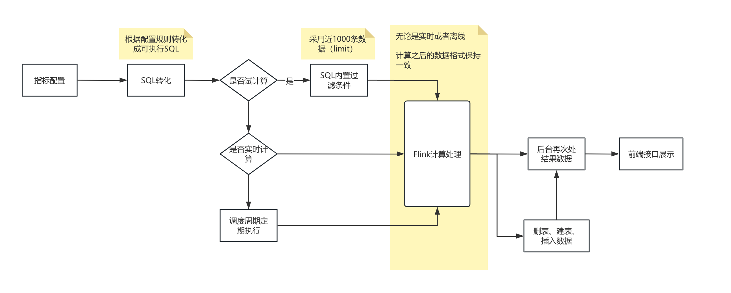 无论实时还是离线计算,指标计算流程统一通过 Flink 执行,避免多套计算逻辑并存。