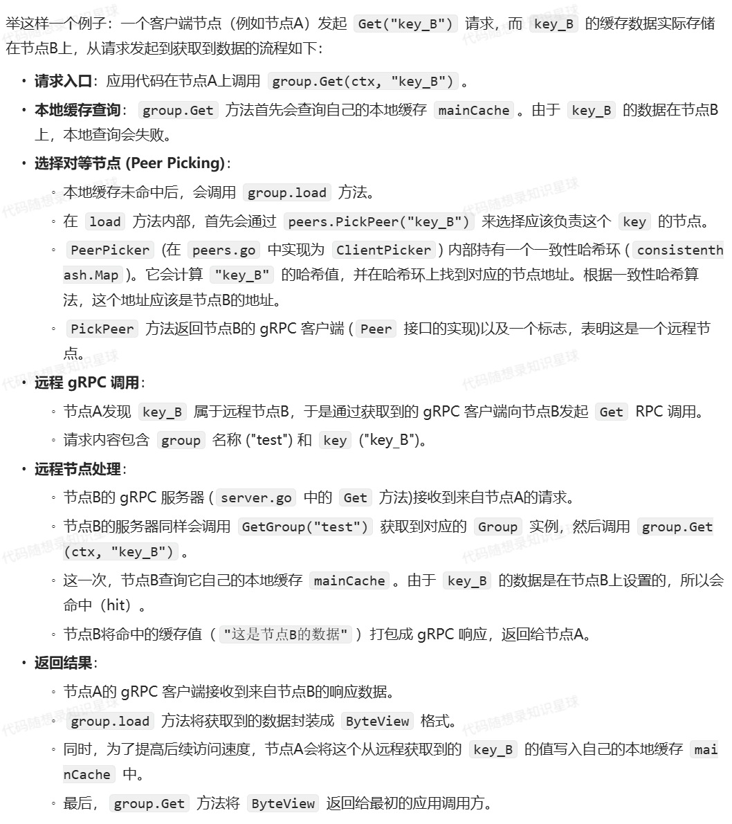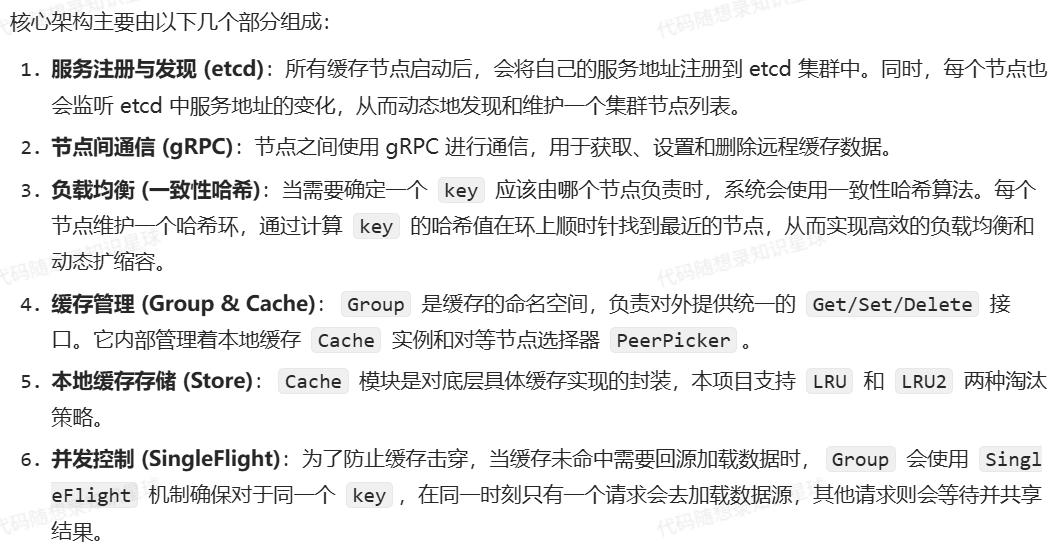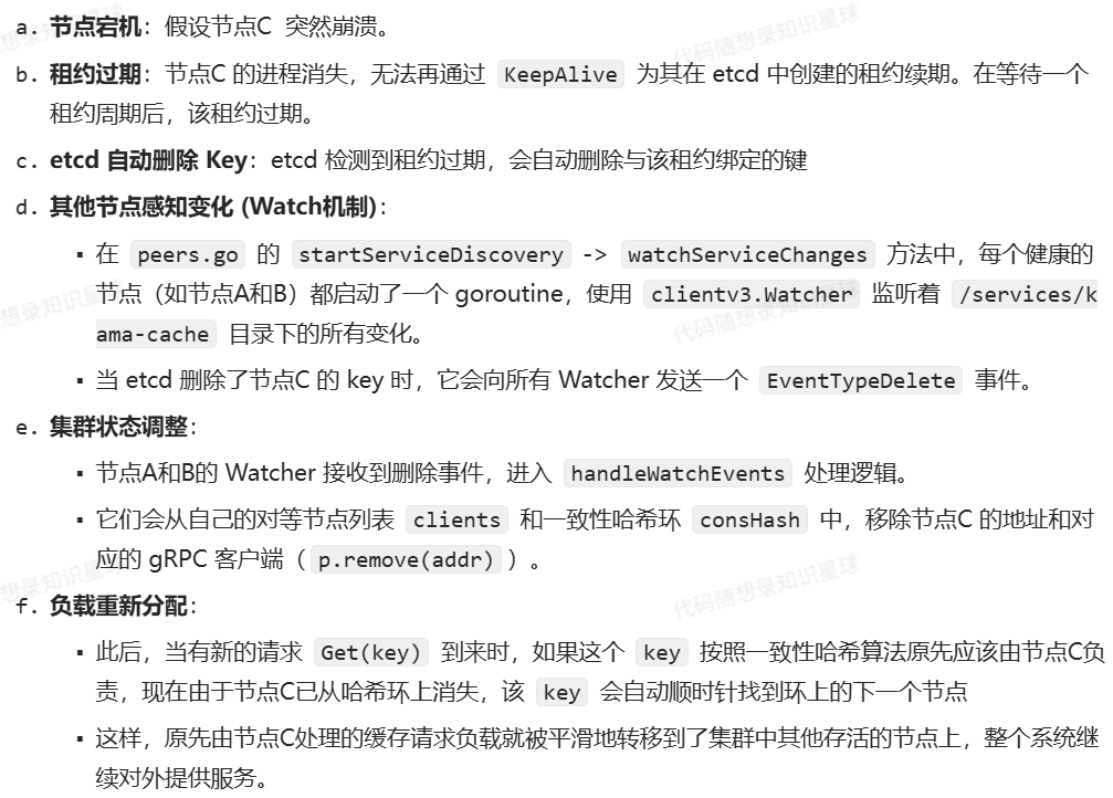 - 一致性哈希:当某个节点宕机后,etcd 的租约(lease)会过期,服务发现机制会将其从节点列表中移除。根据一致性哈希的特性,只有原先由该宕机节点负责的那些 key 会失效并需要重新映射到其他节点,而其他节点上的缓存数据不受影响。这大大降低了单点故障带来的影响范围,避免了全局性的缓存雪崩。