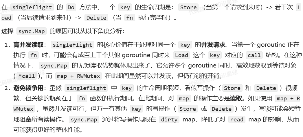 - [7. singleflight 的实现中为什么使用sync.Map而不是map+sync.RWMutex,它们的适用场景有什么不同](#7. singleflight 的实现中为什么使用sync.Map而不是map+sync.RWMutex,它们的适用场景有什么不同)