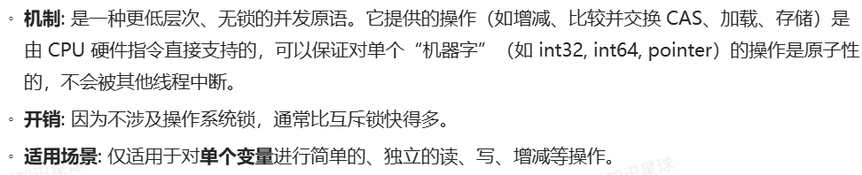 11. 缓存的并发安全需要锁或原子操作来保证,解释一下互斥锁 (Mutex) 和原子操作 (Atomic) 的区别,以及它们各自的适用场景