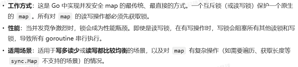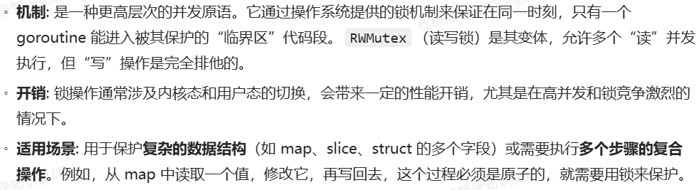 - [互斥锁 (Mutex/RWMutex):](#互斥锁 (Mutex/RWMutex):)