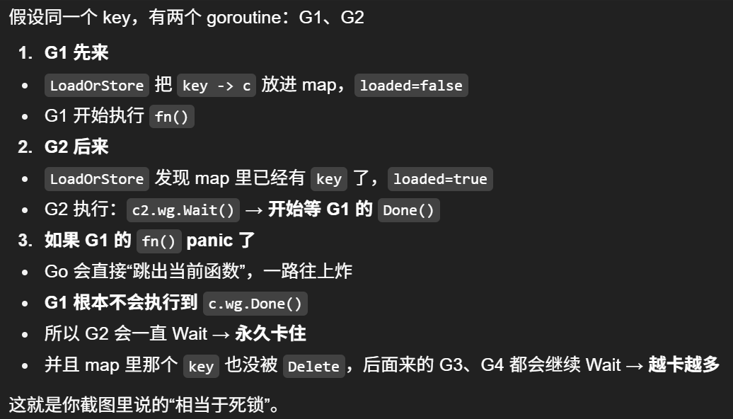 // 关键:用 defer 保证不管 fn 正常返回/报错/甚至 panic,都能 Done + Delete,避免别人永远卡住