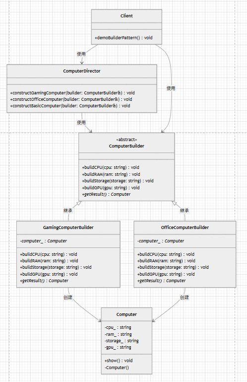 GamingComputerBuilder,OfficeComputerBuilder - Director(指挥者):指导构建过程以及隔离客户与对象的生产过程,比如上面的