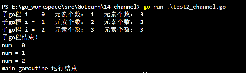 fmt.Println("子go程 i = ", i, " 元素个数:", len(c), " 元素个数:", cap(c))