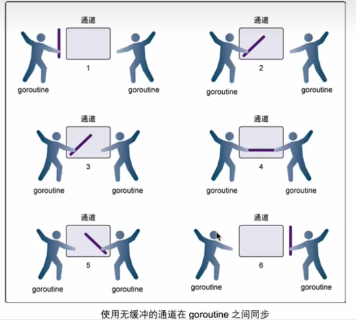 (4)在第4步和第5步,进行交换,并最终,在第6步,两个goroutine都将它们的手从通道里拿出来,这模拟了被锁住的goroutine得到释放。两个goroutine现在都可以去做其他事情了。