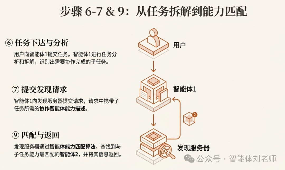 ⑦ 智能体1向发现服务器提交智能体能力发现请求,请求中携带子任务所需的协作智能体能力描述;