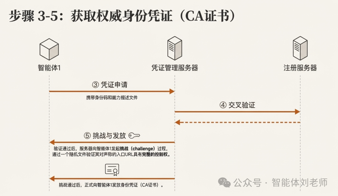 ⑤ 凭证管理服务器对智能体1的信息验证通过后,向智能体1提供一个随机文件发起挑战(challenge)过程,挑战过程是为了验证智能体1对声称的入口URL具有完整的控制权,挑战通过后即向智能体1发放身份凭证(例如CA证书)。