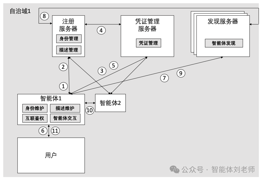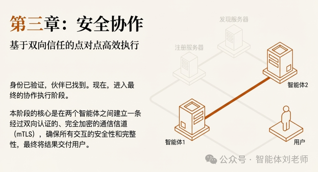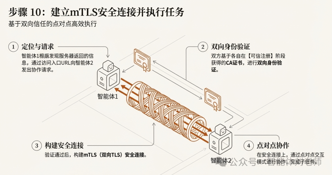 ⑩ 智能体1根据发现服务器返回的智能体2能力描述文件,通过对应的访问入口URL,定位并向智能体2发出协作请求。为确保通信安全,智能体1和智能体2之间会基于双方的CA证书进行双向身份验证并构建mTLS(双向TLS)安全连接,并通过点对点交互模式进行协作完成任务;