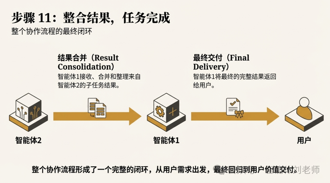 ⑪ 智能体1合并和整理子任务结果,将最终结果返回给用户。