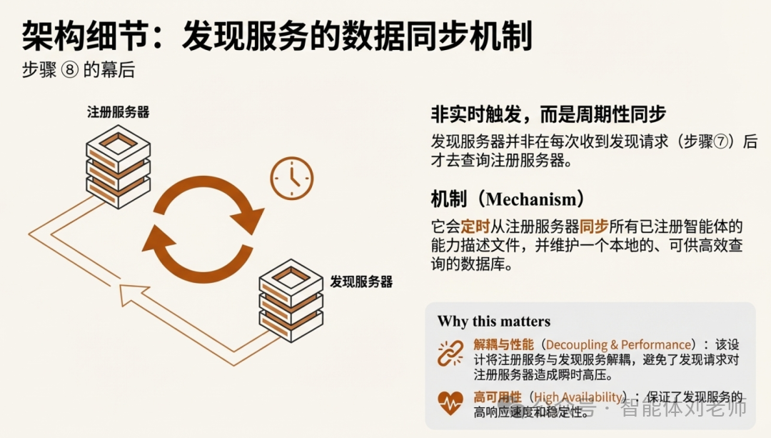 ⑧ 发现服务器通过接口从注册服务器同步所有注册的智能体能力描述文件(注:这一步骤,不是由⑦触发进行的,而是定时同步);