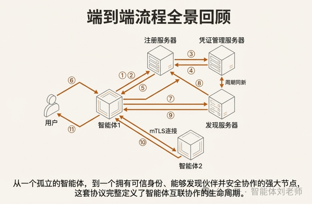 以上是在ACPs/AIP体系架构下的一个完整智能体互联协作流程示例,其中涉及到的一些具体技术要点,刘老师会在后续文章中详细介绍。