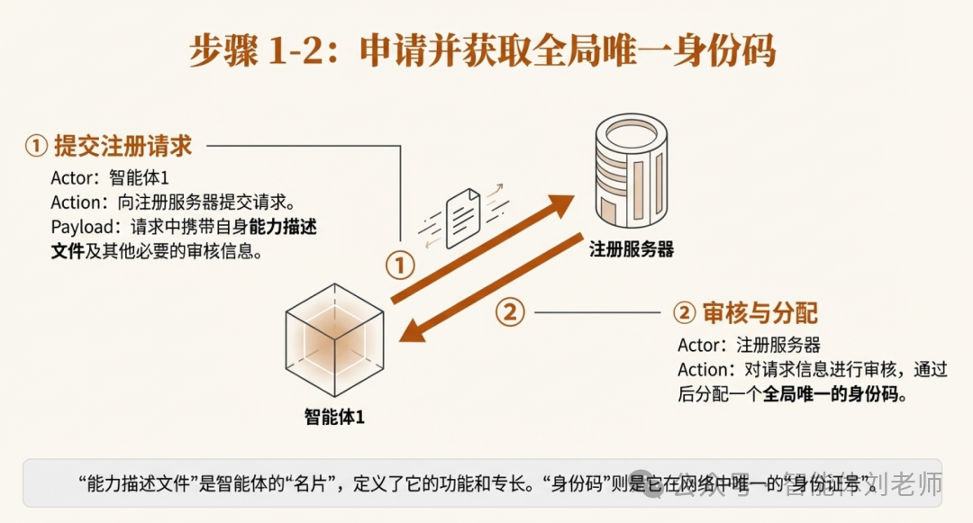 ① 智能体1向注册服务器提交注册请求,请求中携带自身能力描述文件及其他必要的审核信息;