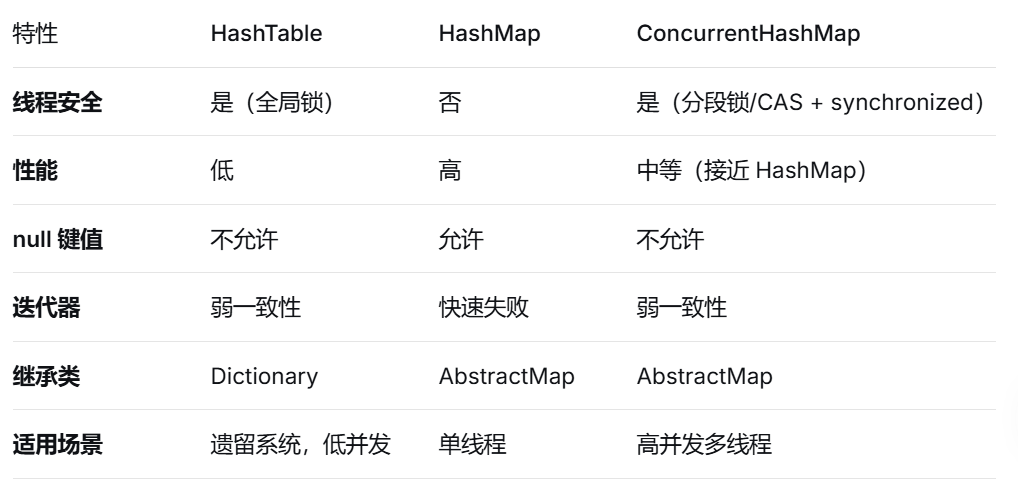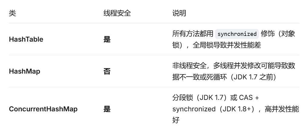 HashTable、HashMap 和 ConcurrentHashMap 是 Java 中三种重要的 Map 实现,以下是详细对比: