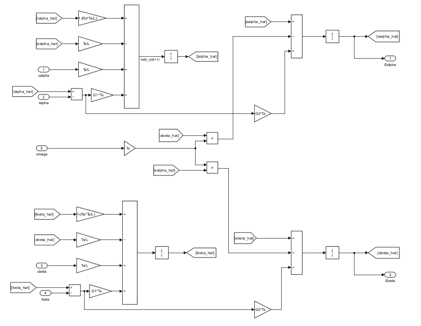 i ^ α ( k + 1 ) = i ^ α ( k ) + T [ − R s L s i ^ α ( k ) − 1 L s e ^ α ( k ) + 1 L s u α ( k ) + K 1 ( i α ( k ) − i ^ α ( k ) ) ] i ^ β ( k + 1 ) = i ^ β ( k ) + T [ − R s L s i ^ β ( k ) − 1 L s e ^ β ( k ) + 1 L s u β ( k ) + K 1 ( i β ( k ) − i ^ β ( k ) ) ] e ^ α ( k + 1 ) = e ^ α ( k ) + T [ − ω ^ e e ^ β ( k ) + K 2 ( i α ( k ) − i ^ α ( k ) ) ] e ^ β ( k + 1 ) = e ^ β ( k ) + T [ ω ^ e e ^ α ( k ) + K 2 ( i β ( k ) − i ^ β ( k ) ) ] \begin{aligned} \hat{i}{\alpha}(k+1) &= \hat{i}{\alpha}(k) + T\bigg[-\frac{R_s}{L_s}\hat{i}{\alpha}(k) - \frac{1}{L_s}\hat{e}{\alpha}(k) + \frac{1}{L_s}u_{\alpha}(k) + K_1\big(i_{\alpha}(k) - \hat{i}{\alpha}(k)\big)\bigg] \\ \hat{i}{\beta}(k+1) &= \hat{i}{\beta}(k) + T\bigg[-\frac{R_s}{L_s}\hat{i}{\beta}(k) - \frac{1}{L_s}\hat{e}{\beta}(k) + \frac{1}{L_s}u{\beta}(k) + K_1\big(i_{\beta}(k) - \hat{i}{\beta}(k)\big)\bigg] \\ \hat{e}{\alpha}(k+1) &= \hat{e}{\alpha}(k) + T\bigg[-\hat{\omega}e \hat{e}{\beta}(k) + K_2\big(i{\alpha}(k) - \hat{i}{\alpha}(k)\big)\bigg] \\ \hat{e}{\beta}(k+1) &= \hat{e}{\beta}(k) + T\bigg[\,\hat{\omega}e \hat{e}{\alpha}(k) + K_2\big(i{\beta}(k) - \hat{i}_{\beta}(k)\big)\bigg] \end{aligned} i^α(k+1)i^β(k+1)e^α(k+1)e^β(k+1)=i^α(k)+T[−LsRsi^α(k)−Ls1e^α(k)+Ls1uα(k)+K1(iα(k)−i^α(k))]=i^β(k)+T[−LsRsi^β(k)−Ls1e^β(k)+Ls1uβ(k)+K1(iβ(k)−i^β(k))]=e^α(k)+T[−ω^ee^β(k)+K2(iα(k)−i^α(k))]=e^β(k)+T[ω^ee^α(k)+K2(iβ(k)−i^β(k))]