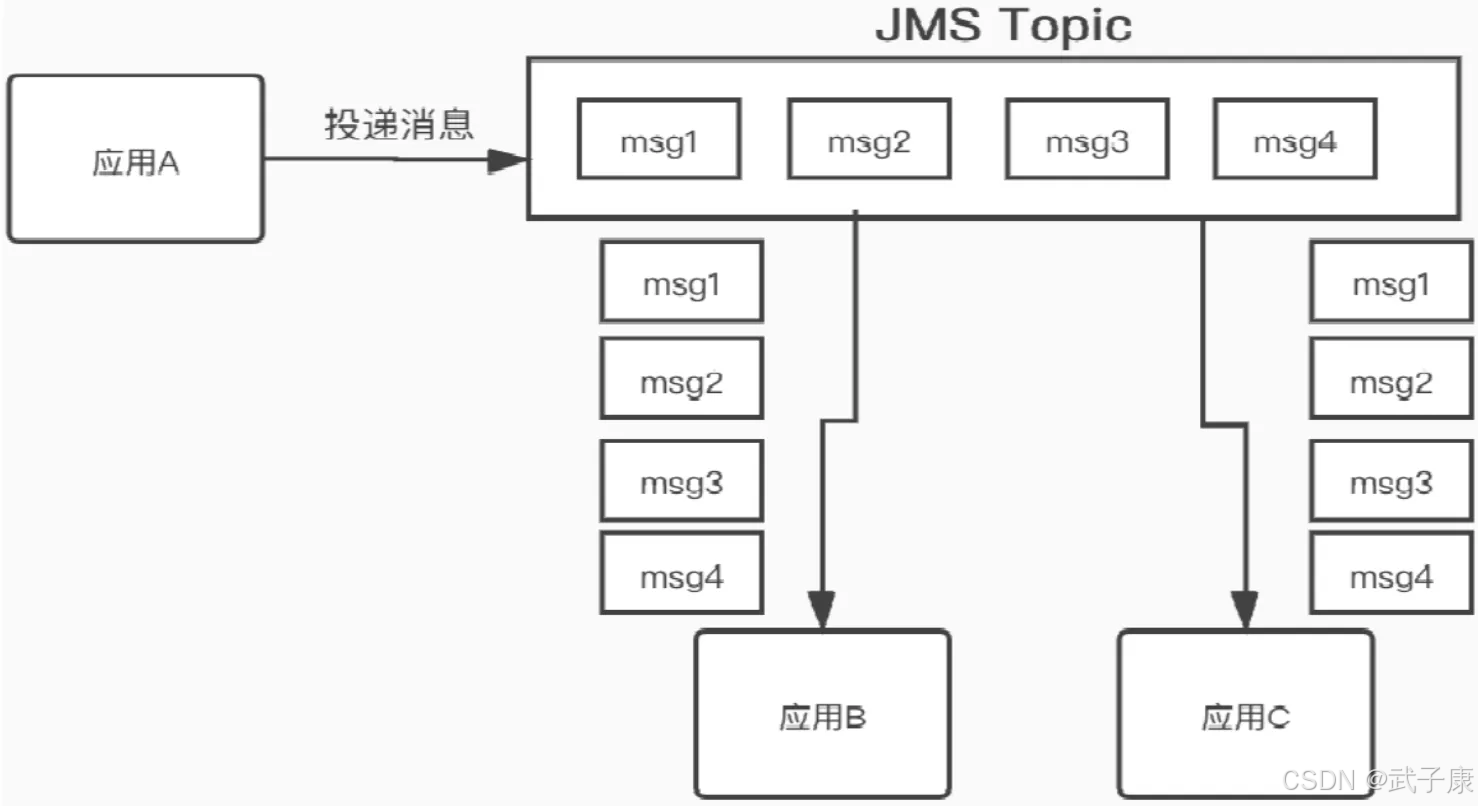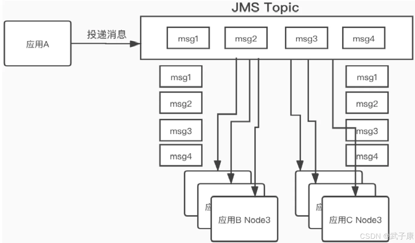 - 不同消费者组的应用则各自获取全量消息(Topic 模式)
