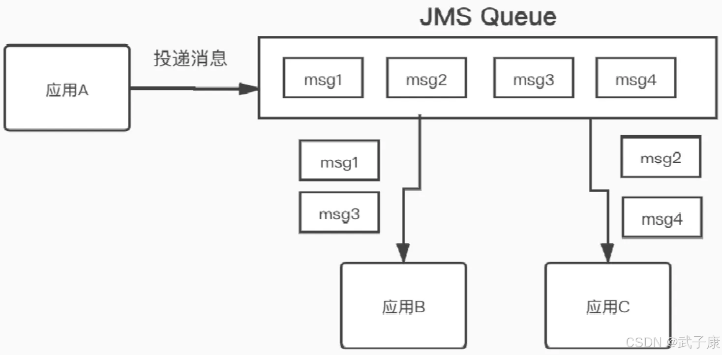 独占消费:队列默认采用"竞争消费"模式,即一条消息只会被一个活跃消费者实例获取。例如在RabbitMQ中,多个消费者订阅同一队列时,消息会通过轮询(Round-Robin)方式分配。