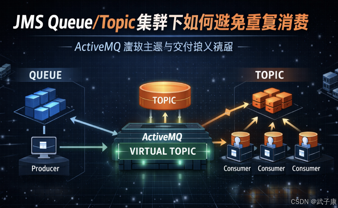 | Topic模式同一条业务在多台应用都执行 | Pub/Sub广播语义:每个订阅者各得一份;同一messageId/业务ID在不同实例日志同时出现;Topic订阅数与实例数一致 | 用Virtual Topic(组内Queue抢占);或JMS 2.0 Shared(Durable) Subscription;最终仍保留业务幂等 |