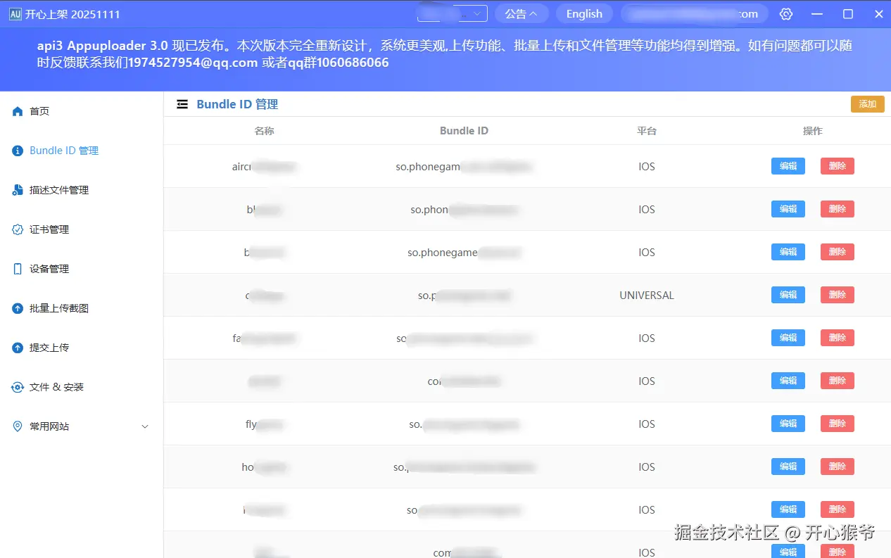 在 Windows 或非 Xcode 环境下,我会用 开心上架(Appuploader)查看 Apple 开发者账号中的 Bundle ID 列表 ,目的并不是创建,而是确认现状。 这让发布流程从一开始就基于"已知事实",而不是假设。