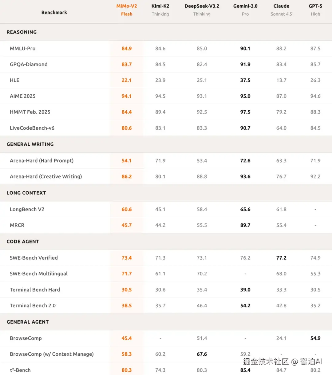 性能表现方面,MiMo-V2-Flash的测试数据如下: