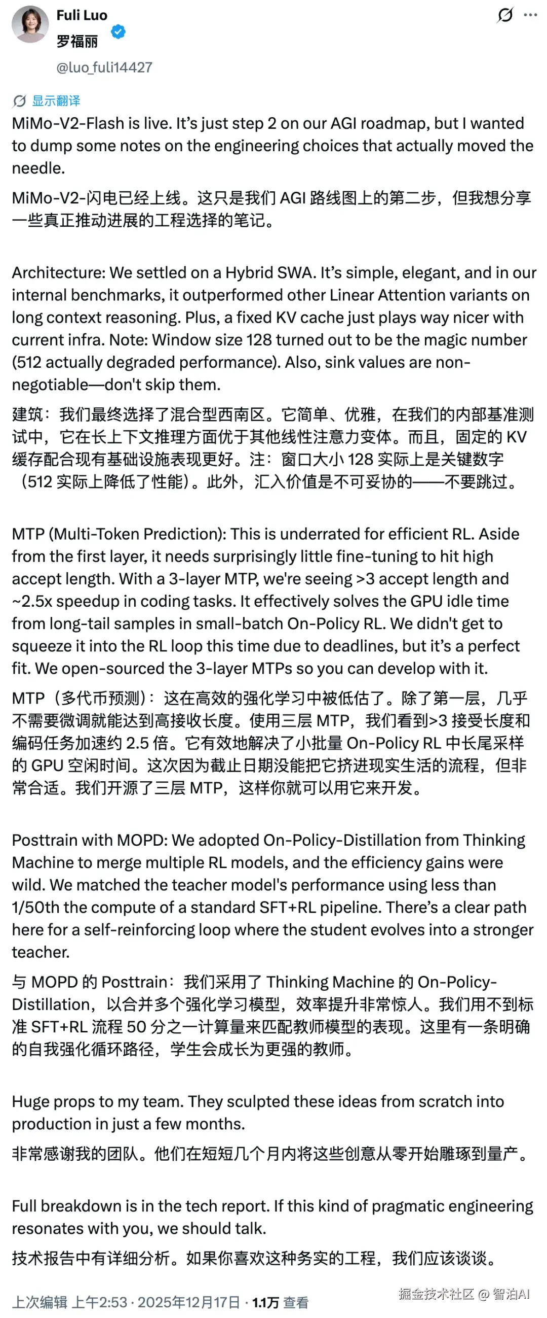 据罗福莉在社交媒体披露的最新动态,"MiMo-V2-Flash现已开放使用。这仅是我们在AGI发展路径中的第二个里程碑。" 仅第二步便已具备如此突破性,后续的技术演进更令人充满想象空间。