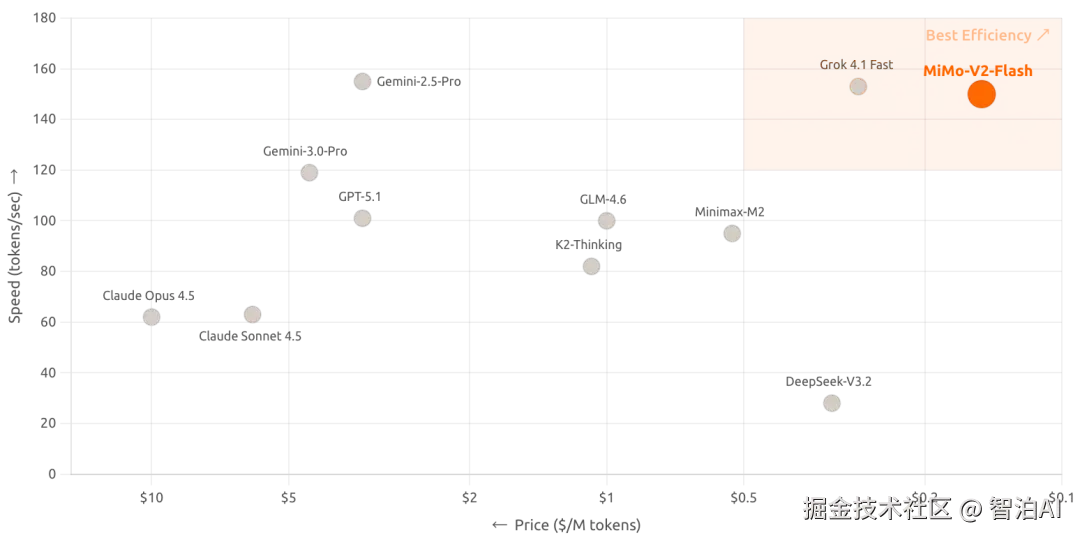 抛开"开源"不谈,新模型的核心突破就是架构设计的颠覆性革新,实现150 tokens/秒的推理速度,并将成本控制在每百万token输入0.1美元、输出0.3美元,以极致性价比为最大卖点。(还得是小米!)