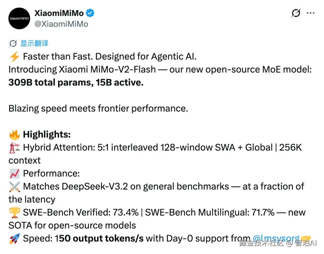 开源界又来了一位重量级新成员!小米今天正式推出并开源其最新模型 MiMo-V2-Flash。