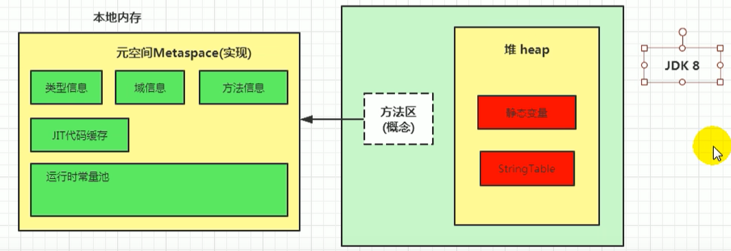 JDK7及以前通过永生代实现的方法区,永生代内存在JVM中;JDK8及以后通过元空间使用方法区,元空间在本地内存中,不属于JVM内存。