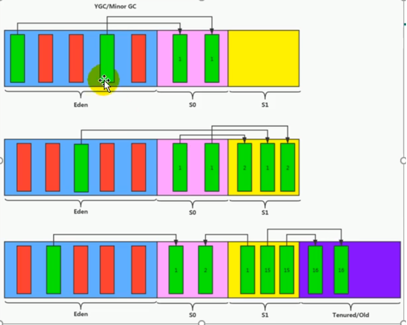 下一次再当eden区满时,清理eden区与幸存者2区的垃圾对象,将两个区的存活对象放到幸存者1区,对象年龄加1,当存活对象的年龄到达15时,将对象放到老年代。