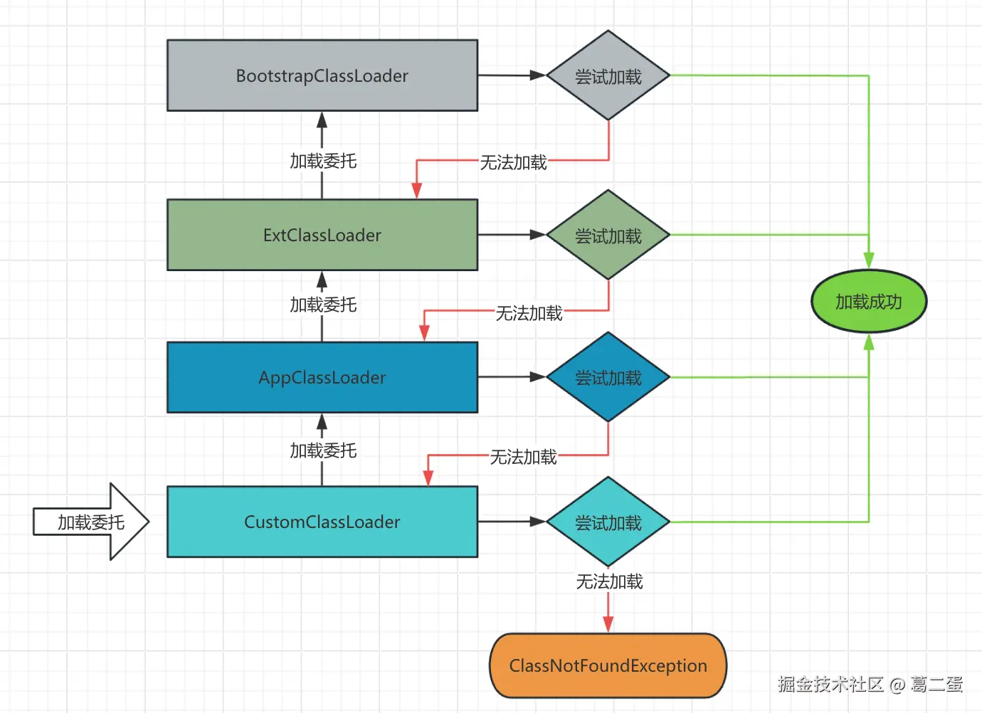 委托链:AppClassLoader → ExtClassLoader → BootstrapClassLoader