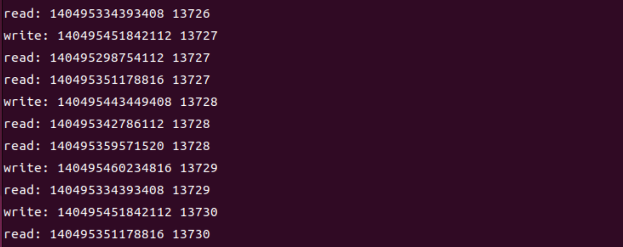 可以看到加了读写锁的程序运行地很好,没有交叉覆盖的情况。