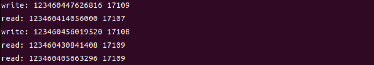截取其中的一段来看,可以看到第二个的write比第一个还小,说明两个写操作可能同时在执行,数据可能被交叉覆盖;第二个read的标识是17107,远早于之前 write的17109------ 说明读操作没有被写操作正确阻塞,在写操作完成前就读取了旧的缓存数据,或者读锁加锁时机错误。