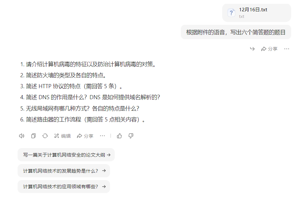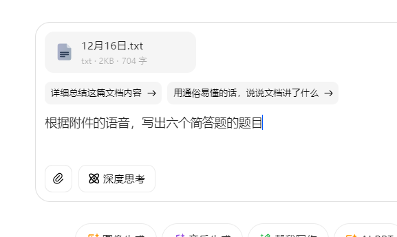 音频有5分钟,我想转成文字,并提炼出简答题题目。