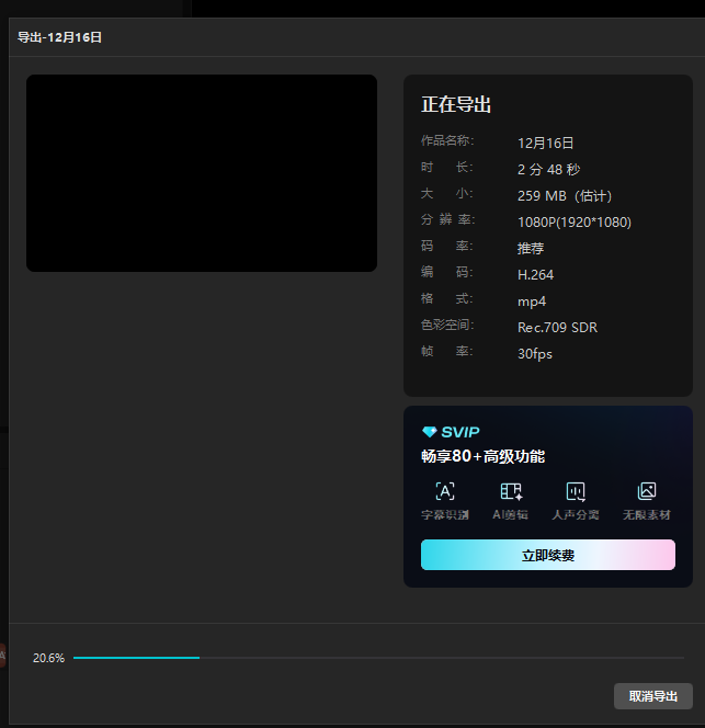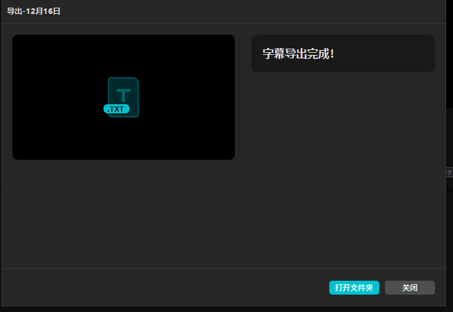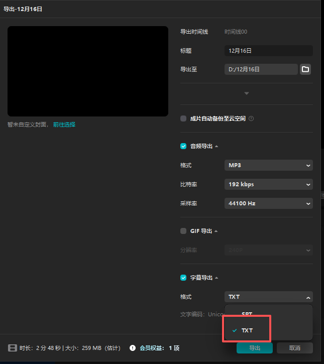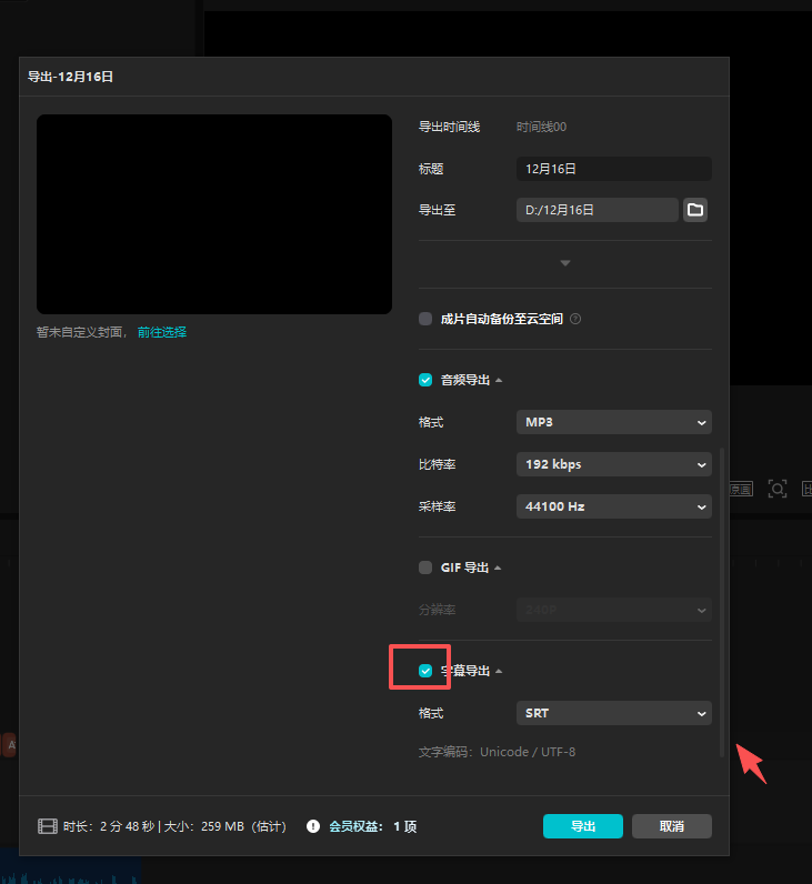 可以把视频和音频的√都关掉,只要导出字幕,1秒完成