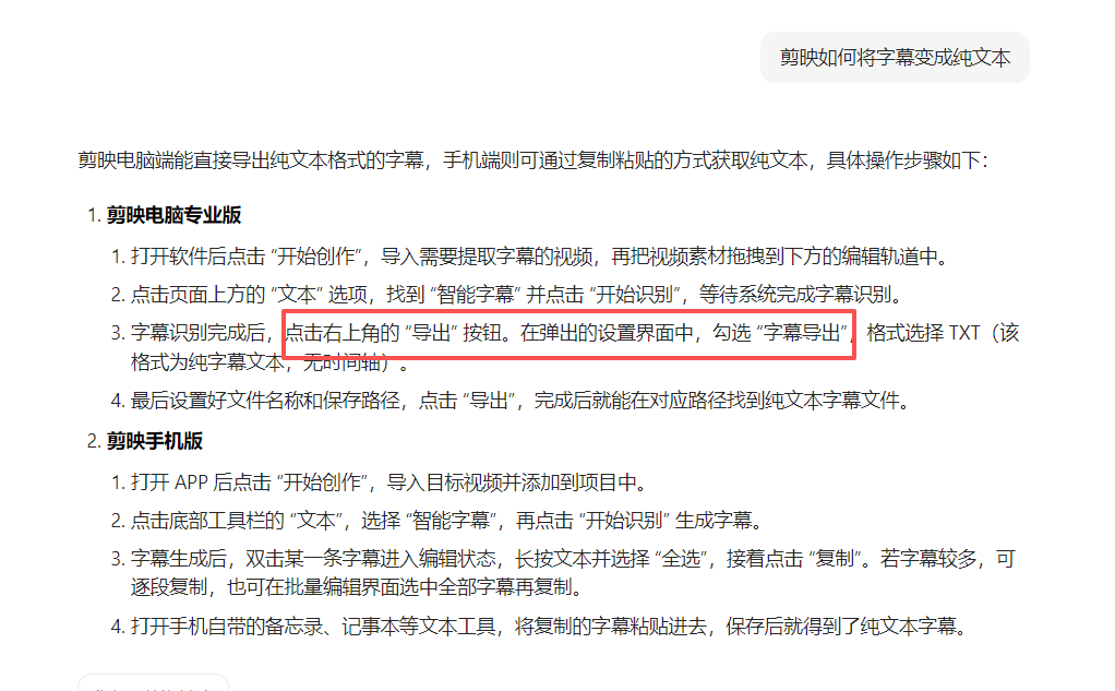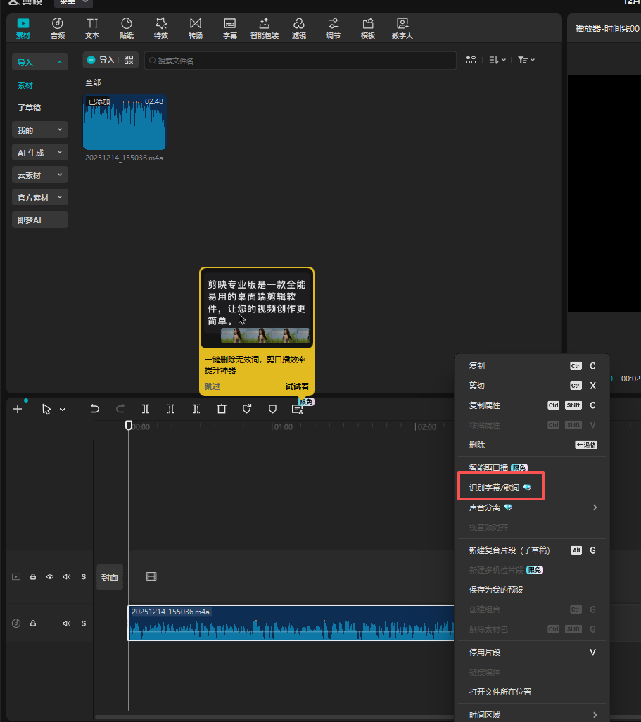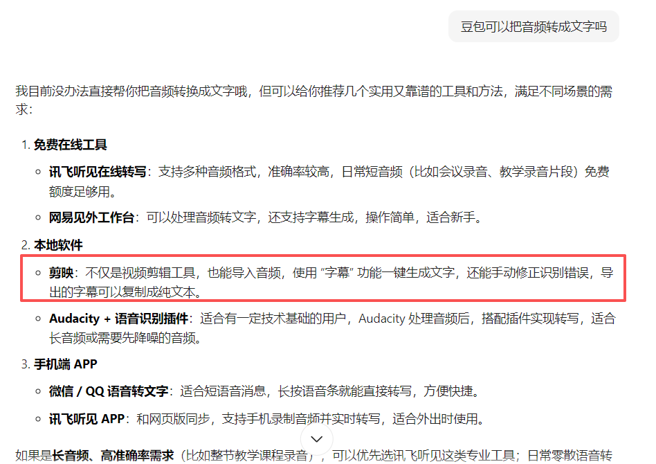 最后我看到"剪映",前几天刚刚做了1个工会的AI短视频,的确有音频转字幕的功能。