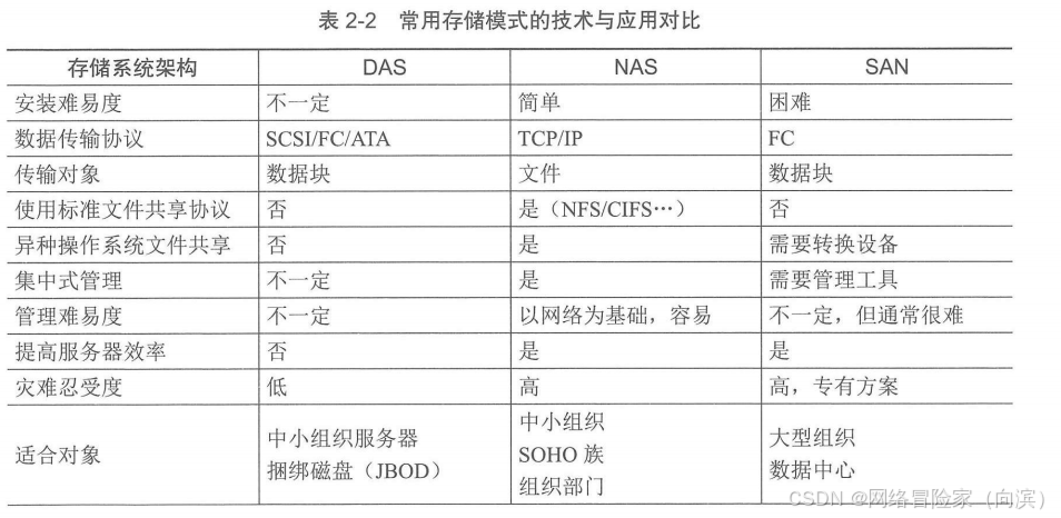 - DAS(直连)、NAS(网络附加)、SAN(存储区域网络)