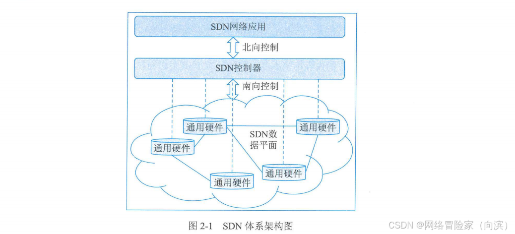 利用分层的思想,SDN 将数据与控制相分离。在控制层,包括具有逻辑中心化和可编程的控制器,可掌握全局网络信息,方便运营商和科研人员管理配置网络和部署新协议等。在数据层,包括哑交换机(与传统的二层交换机不同,专指用于转发数据的设备),仅提供简单的数据转发功能,可以快速处理匹配的数据包,适应流量日益增长的需求。两层之间采用开放的统一接口(如 OpenFlow 等)进行交互。控制器通过标准接口向交换机下发统一标准规则,交换机仅需按照这些规则执行相应的动作即可。SDN 打破了传统网络设备的封闭性。此外,南北向和东西向的开放接口及可编程性,也使得网络管理变得更加简单、动态和灵活。