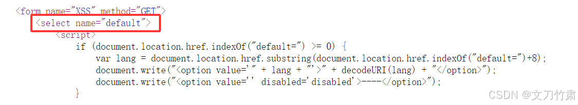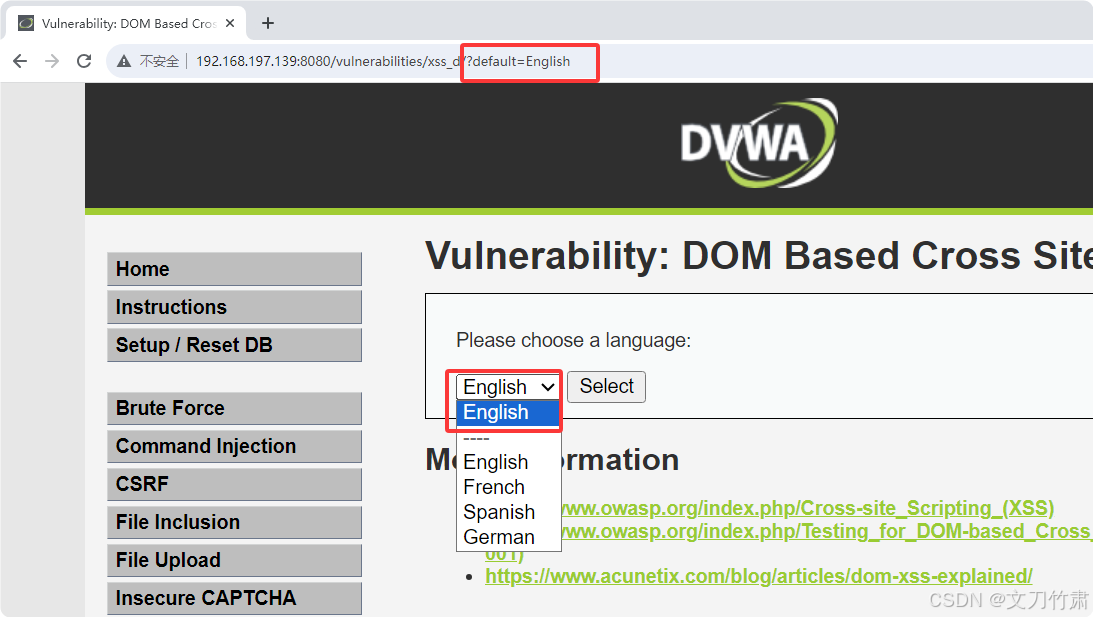 1.安全级别设置为Medium,进入DOM型XSS攻击页面,查看页面源码,发现将 <script 标签替换成了 ?default=English,所以之前的攻击载荷无法正常工作。但查看页面源码会看到一个 select 语句;稍微修改一下攻击载荷即可绕过防御。