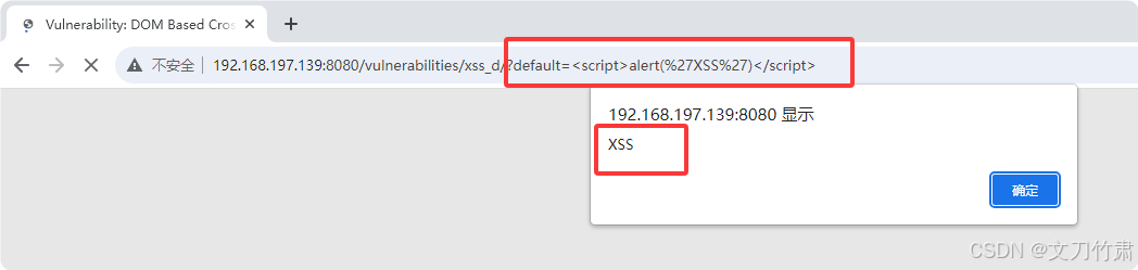1.安全级别设置为Low,点击XSS(DOM),进入DOM型XSS攻击页面。可以看到 URL 参数 default