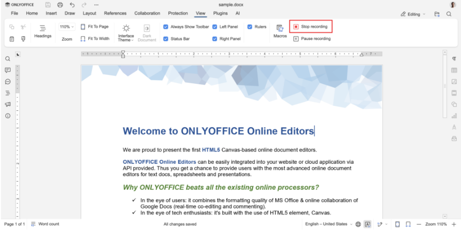 不过,对部分用户来说,手动编写宏代码仍然存在一定门槛 。为此,ONLYOFFICE 进一步推出了 "录制宏(Record Macro)"功能,让用户无需编程,只需"操作一遍",就能生成可重复使用的宏脚本,大幅降低自动化使用难度。