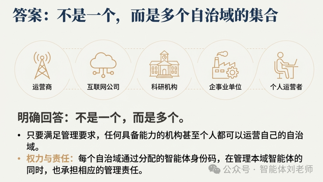在经过管理机构验证管理能力后,智能体互联网中可以有多种类型的自治域,例如运营商、互联网公司、科研机构、企事业单位,甚至个人运营者。只要满足一定的管理要求,就可以管理和运营自己的自治域。每个自治域,通过分配的智能体身份码,在享受本域智能体的管理权力的同时,承担本域智能体的管理责任。