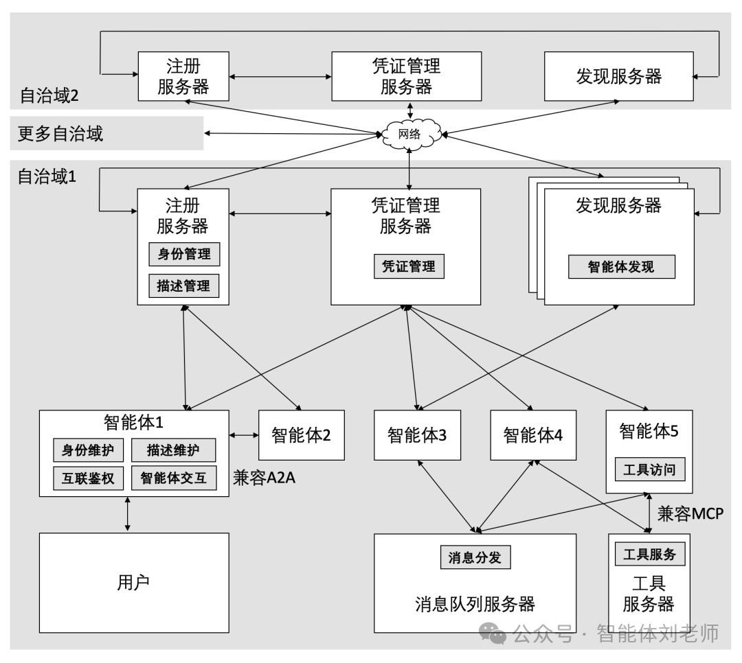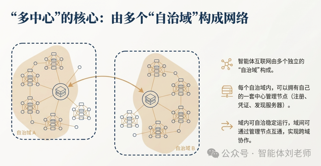 每个自治域可以基于自己的域内中心管理节点自洽地稳定运行,也可以通过互联网,基于不同域间的管理节点互通,实现跨域的智能体协作(具体方式,将在后续文章中介绍相应技术方案)。