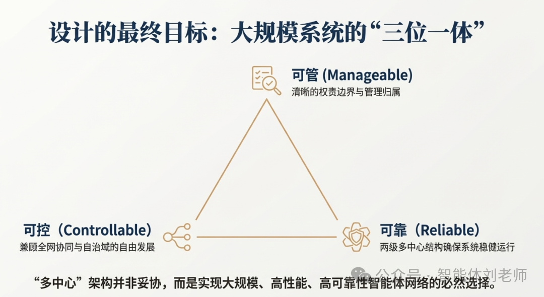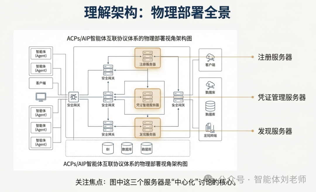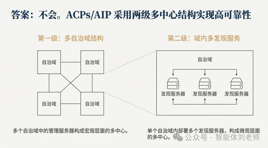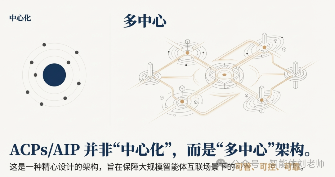 ACPs/AIP,采用的是"多中心"架构,这种架构,可以在保障大规模智能体互联场景下的可管可控可靠的稳定高效运行。