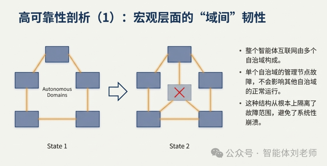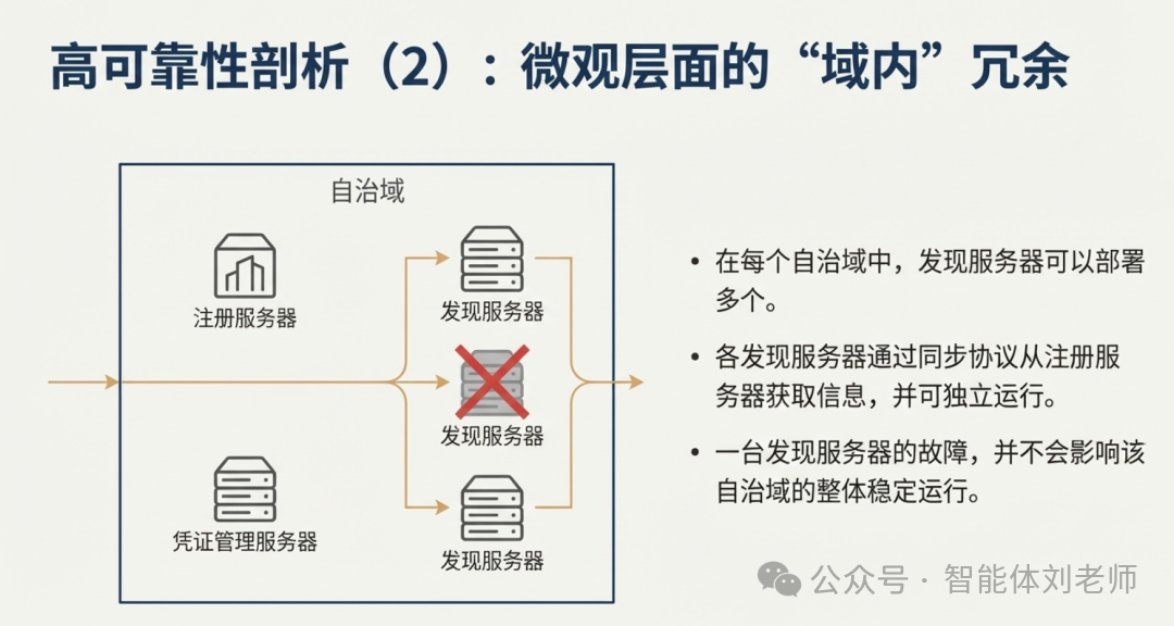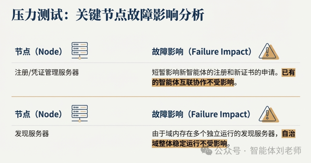 当注册服务器和凭证管理服务器出现故障时,会短暂影响智能体注册和申请新的证书,但并不会影响已有智能体的互联协作。
