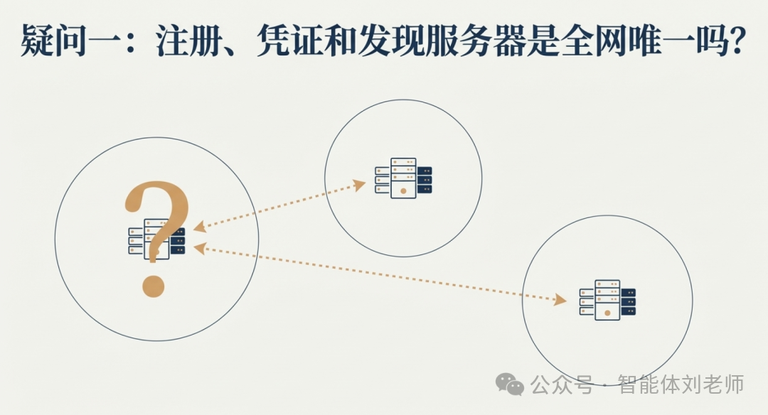 在这个图里,大家比较关心的"中心化"节点,主要是图中的三个服务器:注册服务器、凭证管理服务器和发现服务器。关于中心化和这三个服务器,主要的问题有:
