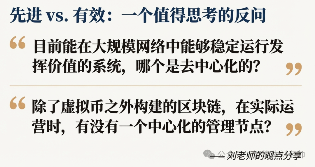 这里刘老师想用一个反问分享一个不太一样的观点:目前能在大规模网络中能够稳定运行发挥价值的系统,哪个是去中心化的?