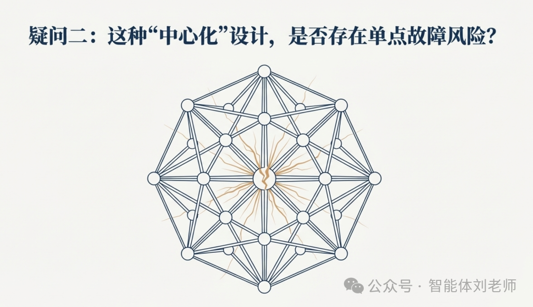 突然,好像观众席又有另一个响亮的声音响起:我们熟知的A2A智能体互联协议,就是去中心化的,没有一个管理服务器节点啊。呵呵,如果刘老师告诉你,基于A2A的厂家构建的智能体互联平台中,是有一个中心化的注册服务器,此时的你会怎么想?你会不会想到,那为什么A2A协议里不提到这个注册服务器呢?是啊,提出A2A协议的这个厂家,为什么不提这个注册服务器呢?想知道这个答案,欢迎约刘老师面聊,刘老师来告诉你答案。