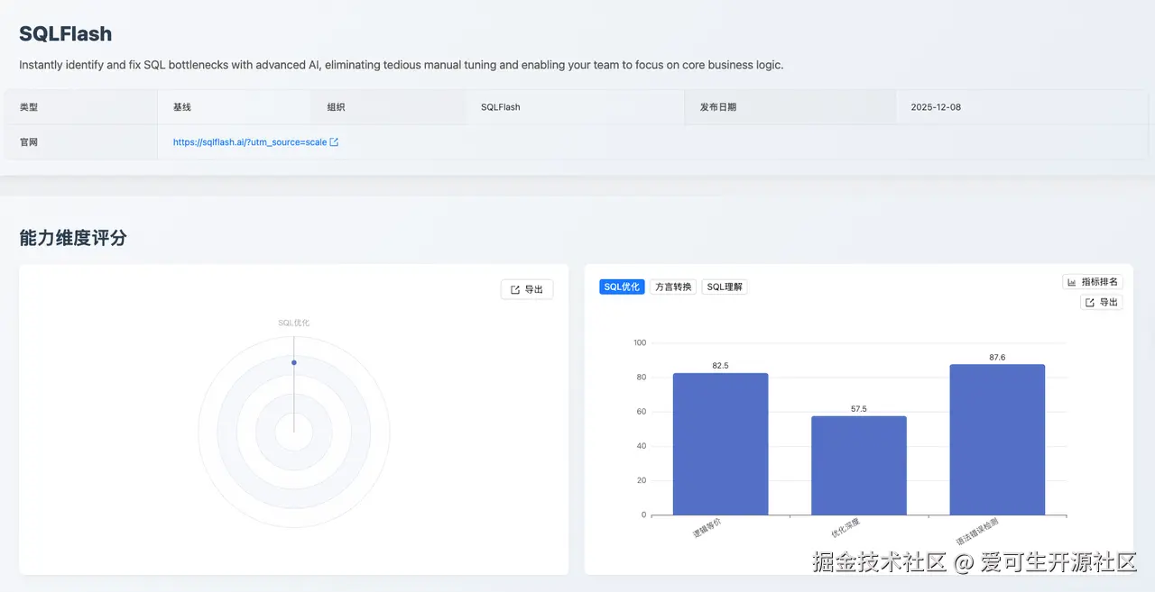 - 专业价值 :在 AI 生成代码领域,高标准的语法遵循是工程化部署的首要前提。此项数据有力佐证了 SQLFlash 具备 辅助开发人员进行代码规范性校验 的能力。